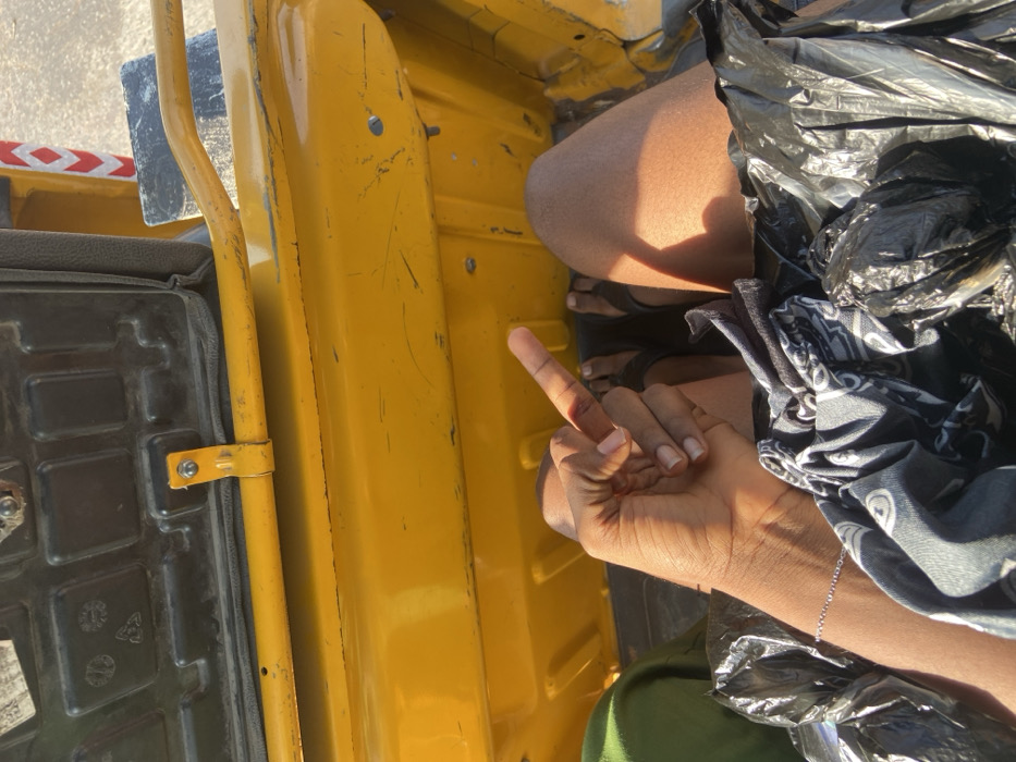 The image depicts a first-person view from within a yellow metal vehicle, consistent with a tricycle, in Ojoto, Nigeria. The lower body of a dark-skinned individual is visible, including bare legs, feet wearing black flip-flops, and a portion of the left arm with a silver-colored chain bracelet. The individual's right hand is raised, with the middle finger extended vertically. A small reddish-brown mark is present on the extended middle finger. Crumpled black plastic bags and a black-and-white patterned fabric are situated on the individual's lap. The vehicle's interior consists of scratched yellow painted metal surfaces. Above, a black, ribbed plastic structure, possibly the underside of a seat or a storage compartment lid, is visible, secured by a yellow metal bracket and horizontal bar. The scene is brightly illuminated by natural light, casting pronounced shadows.