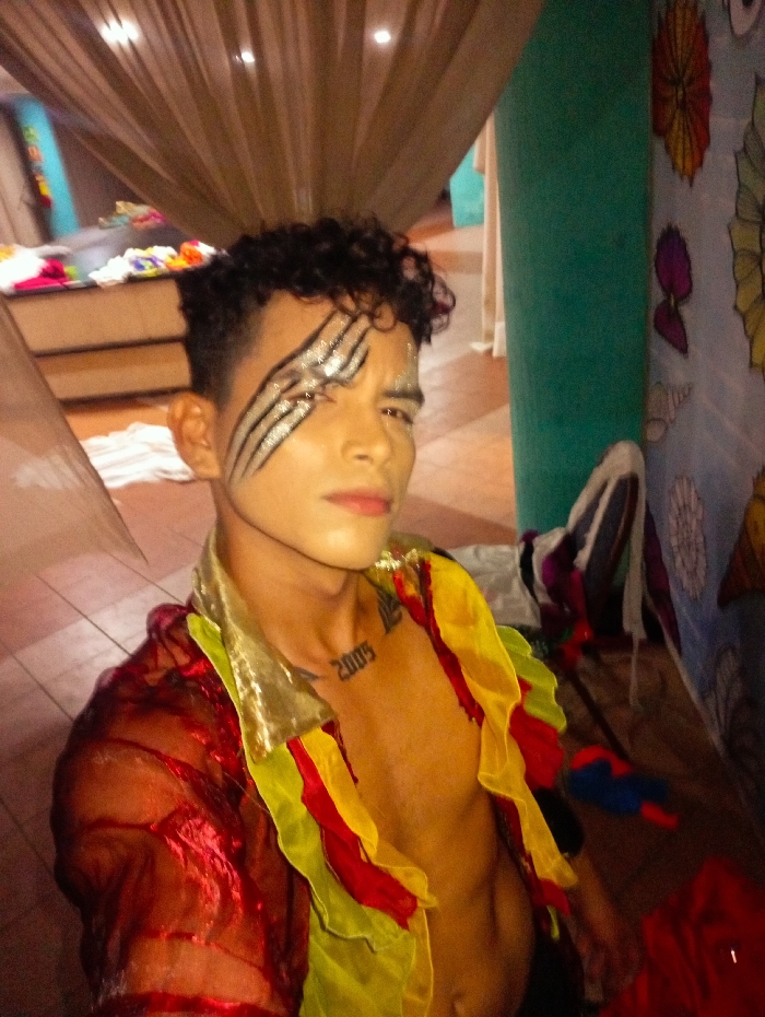 The image displays a young male individual in an indoor or semi-enclosed setting, identified as being in Playa El Agua, Venezuela. He has dark, curly hair and looks directly at the camera. His left eye is adorned with face paint consisting of silver glittered stripes outlined in black, extending diagonally across his temple. A tattoo reading "2005" is visible on the left side of his upper chest. He wears an open, sheer, crinkled fabric shirt with a metallic gold collar; the right sleeve is red, and the front panels are layered in red and yellow, exposing his bare chest and abdomen. The background features a light brown tiled floor and an overhead canopy of draped, translucent tan fabric with visible lights. To the left, a counter with folded colorful textiles is present. To the right, a teal-colored pillar stands adjacent to a wall adorned with a patterned tapestry depicting stylized colorful motifs, possibly floral or shell-like. On the floor in the right background, a red object and a smaller blue and red object are visible.