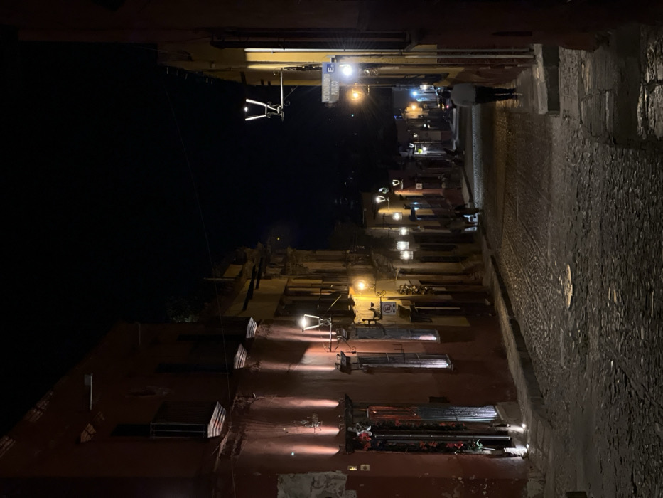 A nighttime view down a narrow, cobbled street. The road slopes gently downward, flanked by tall buildings with warmly lit windows and balconies. Streetlights illuminate the scene, casting shadows and highlighting the textured surfaces of the buildings and road. A person walks away in the distance, adding a sense of scale. The darkness above contrasts with the golden glow below.