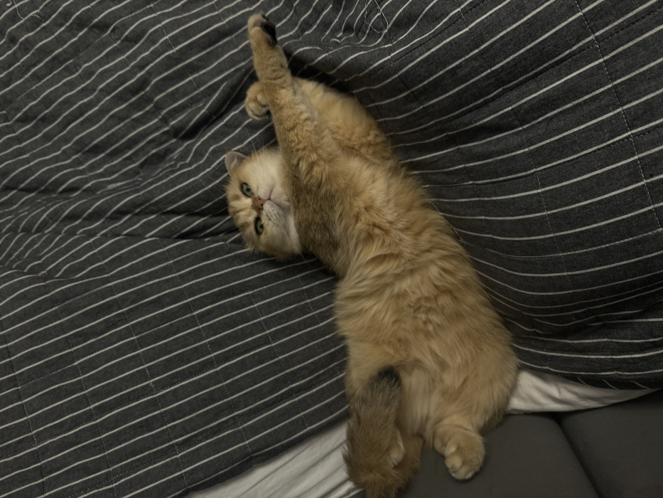 An indoor scene in Akulovo (Gp Kubinka), Russia, features a single domestic cat. The cat, exhibiting golden-orange fur and green-yellow eyes, is positioned on its back on a dark grey textile surface with vertical white stripes. Its right front paw is extended upward, bent at the wrist, and its rear paws are curled. The cat's facial muscles are contracted, presenting narrowed eyes and a partially open mouth exposing teeth. A solid dark grey fabric surface is visible to the left of the cat.