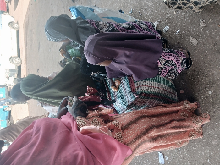 In Plumtree, Zimbabwe, a group of five individuals, primarily children and one adult, are gathered around several large bags on a dirt and concrete ground surface. The scene takes place outdoors, possibly at a market or transport hub, with two vans visible in the distant background—a light blue one on the left and a white one on the right. On the far left, an adult, whose upper body is mostly obscured, wears a pink head covering and a long, light peach-colored patterned dress. Their dark-skinned hands are visible, holding a small, green, possibly leafy item near the center of the gathering. To their right, a child or young individual with an olive green head covering bends over, looking down at the items in the bags. Adjacent to them on the right, another child or young individual, wearing a dark grey, slightly embellished head covering and a black dress with pink and black patterns, also looks into the bags, reaching towards a yellow/orange fruit. In the immediate foreground, center-right, a smaller child wearing a dark purple head covering and a black dress with vibrant pink and black patterns holds a small, light-colored, elongated object in their right hand. The central focus of the group is a large, checkered green, white, and brown woven bag, with another white and blue striped bag partially visible to its right. Various small items, including what appear to be fruits or produce, are visible in and around these bags. The ground is dusty, strewn with small pieces of paper, cardboard, and other debris.