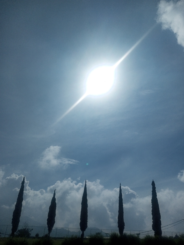 Five tall, slender trees stand in silhouette against a backdrop of puffy, white clouds and a bright, blue sky. The sun shines intensely from above, casting a radiant glow. A fence is visible in the midground behind the trees. Darker foliage fills the lower section of the frame. The overall impression is one of stark contrast and bright daylight.