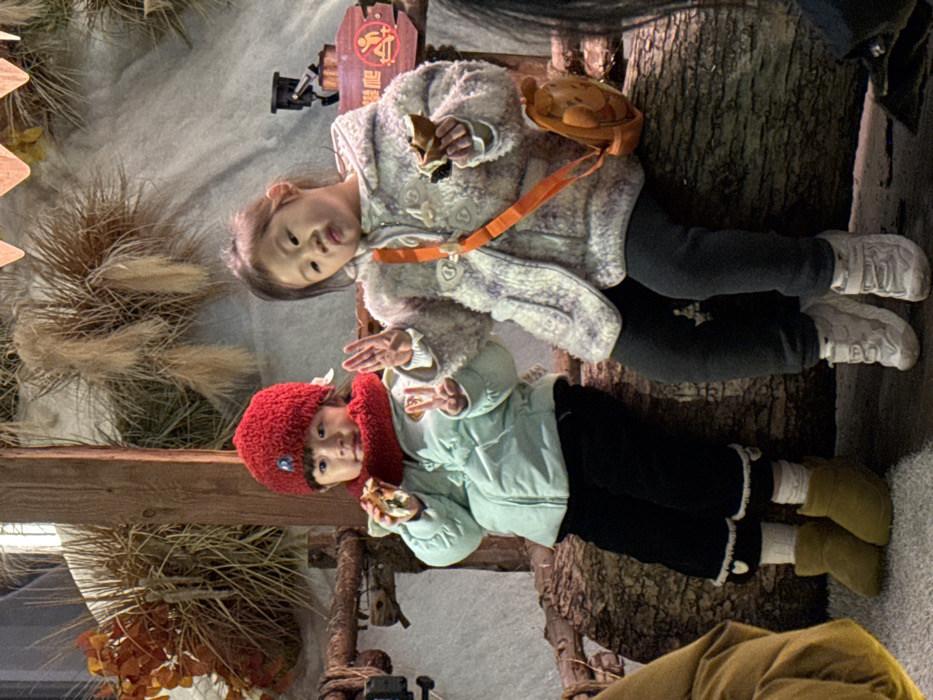 - "Two young East Asian children are seated side-by-side on a large, debarked wooden log within a themed, artificial winter environment in Liangjiang, China" by FM-K0Kp62, licensed under CC BY 4.0