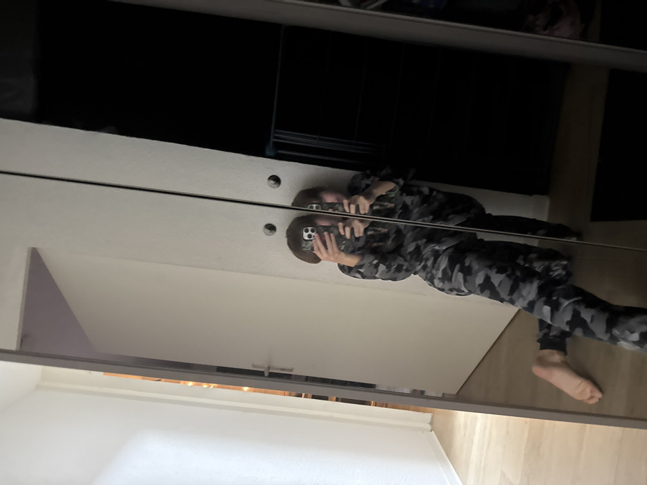 A person in camouflage pajamas is reflected in a mirror, holding a phone and taking a photo of themself. The reflection shows a dark closet above and a bright room below, indicating the mirror is attached to closet doors. The person is barefoot and standing on a light-colored floor. The mirror seems to have a horizontal divide or imperfection across its surface.