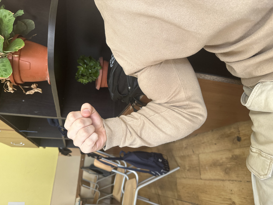 The image depicts an indoor scene in Cherven Bryag, Bulgaria, within what appears to be a classroom or institutional setting. In the foreground, the right arm and upper torso of an individual are visible. The individual is wearing a light tan, long-sleeved, ribbed knit sweater and light-colored pants. The arm is bent at the elbow, with the hand clenched into a fist, displaying a flexed bicep. The skin on the visible hand is fair. The background to the left features several light-colored wooden-top desks with white metal frames and matching chairs; a dark blue fabric backpack hangs on one of the chairs. The floor is constructed of light brown wooden planks. The wall is painted two-toned, with a yellow upper section and a lighter, possibly off-white, lower section, separated by a horizontal line. To the right, a dark brown or black shelving unit is present. On the top shelf, a brown terracotta pot contains a green plant with some visibly withered, brown leaves. On the shelf below, another smaller brown terracotta pot holds a compact green plant. A black backpack rests on a flat surface beneath the lower shelf. Lighting suggests ambient indoor illumination.