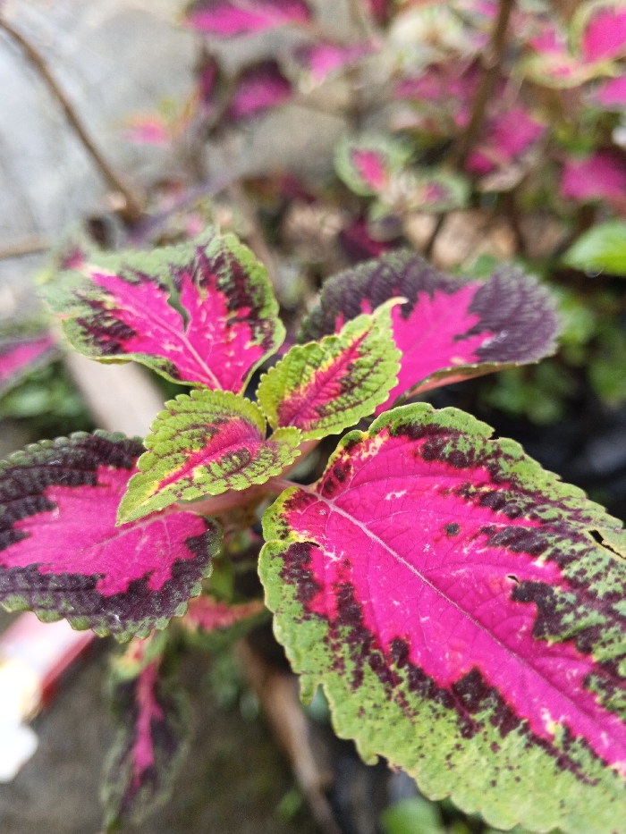 A close-up shot showcases vibrant coleus plants. The leaves are a mix of bright pink, green, and dark purple, with textured edges. Patterns vary across each leaf, some having concentrated dark markings along the borders while others boast bold pink centers. The plant's arrangement is dense, creating a layered effect that catches the eye. A branch extends beyond the left side of the plant with a white blossom.