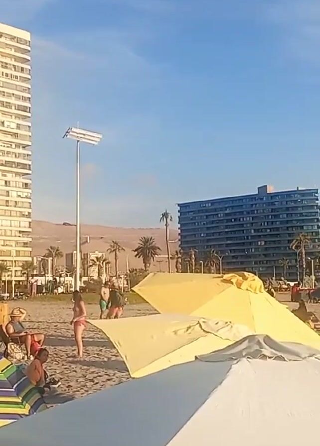 crowded beach on a sunny day. There are many people on the beach, some are sitting under umbrellas of various colors, while others are walking around. In the background, there are tall buildings and a mountain range. The sky is blue with a few clouds. Palm trees are also visible among the buildings.