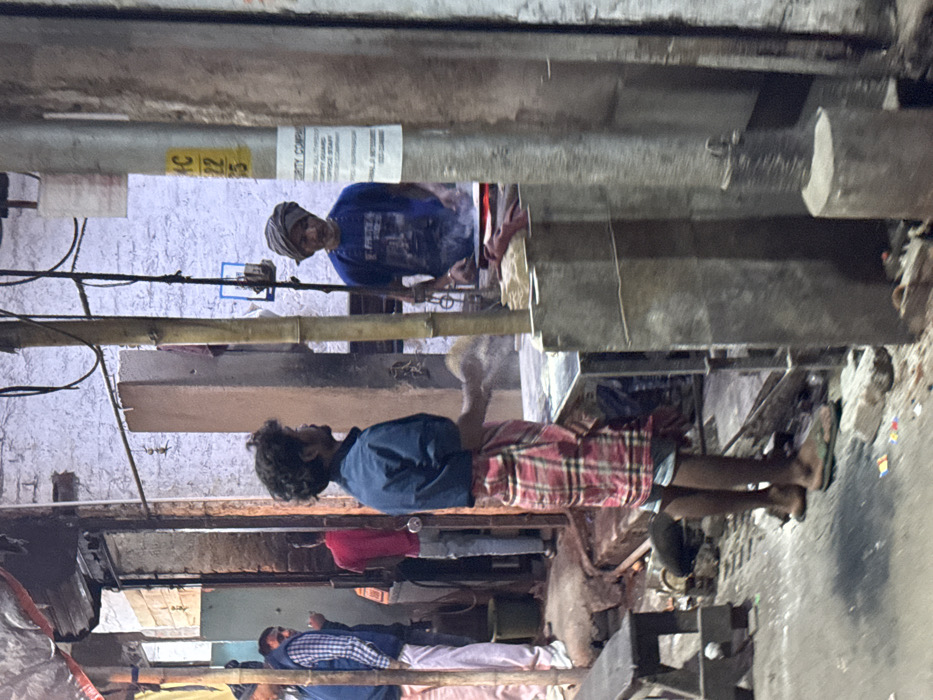 The image displays an informal street food setting at night in Kolkata, India. In the left-center foreground, a man with curly hair, clad in a dark blue short-sleeved shirt, a red and white checkered lungi over shorts, and flip-flops, actively prepares food on a metal griddle, with steam visibly rising. To his right, an older man wearing a light-colored turban and a blue t-shirt stands behind a second cooking station, facing forward with steam emanating from his griddle. In the left background, two additional men are present: one in a blue vest over a checkered shirt and white trousers, appearing to consume food, and another in a red shirt, facing away. The immediate environment includes rough, light-colored walls, exposed electrical wiring, bamboo support poles, and a large metal pole with a yellow sign displaying "4C 22 25" and a partial white sign. The ground is uneven, littered with small debris, and a low wooden bench occupies the left foreground. Artificial light sources illuminate the scene.