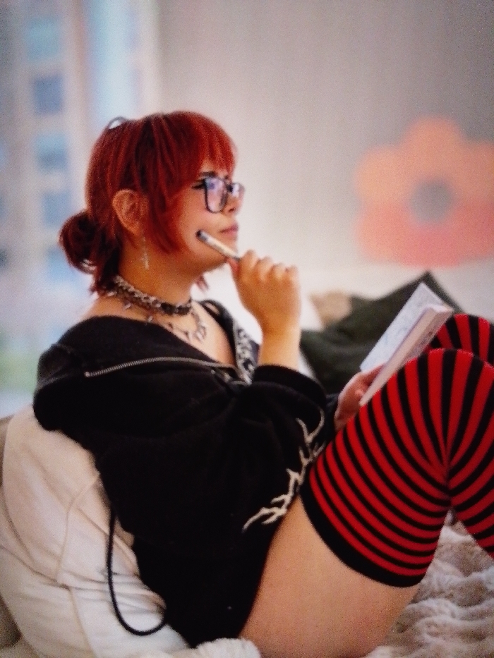 An indoor scene captured in Lares, United States of America, depicts a young female individual from the mid-torso upwards, seated or reclining, and oriented towards the right of the frame. She possesses red hair, styled with bangs and gathered into a bun at the back. Dark-framed glasses are worn on her face. Her attire consists of a black zippered hoodie, a studded choker necklace, and an additional necklace featuring a distinct pendant. She also wears red and black striped thigh-high socks. The individual's right hand is raised, holding a silver pen or marker with a black tip near her chin, suggesting a thoughtful posture. Her left hand holds an open notebook or book with white pages, positioned against her body. A white pillow or cushion is visible behind her left arm and back, providing support. Her legs, clad in the striped socks, rest on a light-colored, textured surface, possibly a blanket. The background features a light-colored wall. A blurred, orange-red, cloud-like or floral-shaped decorative object is affixed to the wall in the mid-right section. To the far left background, blurred architectural structures are visible through what appears to be a window, indicating an urban or residential setting outside. The lighting in the scene is bright and diffused.