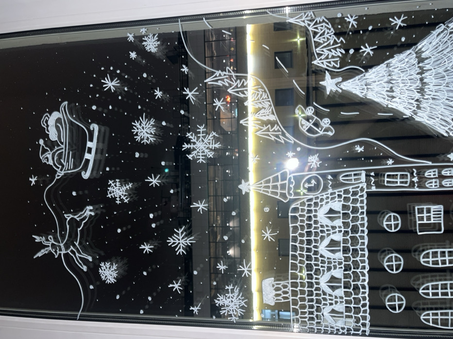 A window pane features a whimsical Christmas scene in white paint