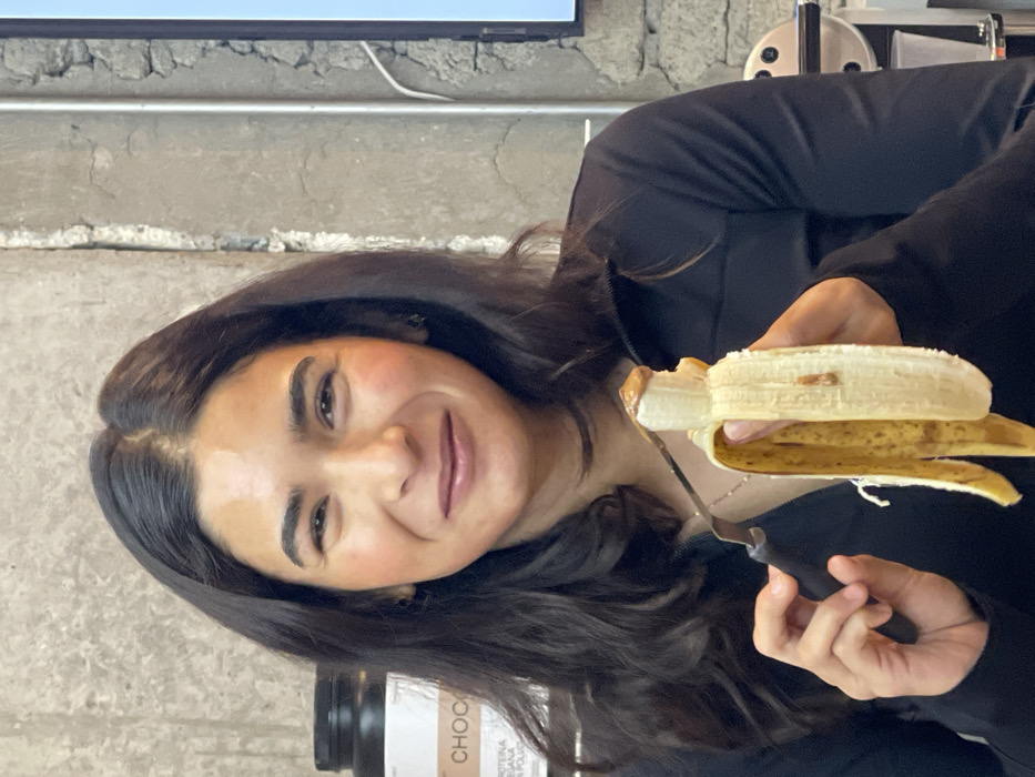 A young adult female with dark hair and a light-medium complexion smiles directly at the viewer. She holds a partially peeled yellow banana in her left hand, which has a brown, pasty substance applied to its tip. In her right hand, she holds a small knife or spreader with a black handle. She is wearing a dark, long-sleeved athletic top with a partial zipper. The background features a textured, light grey concrete wall or pillar. To the left, a large dark container with "CHOCO" and "PROTEINA VEGANA EN POLVO" (Vegan Protein Powder) visible on its label is partially obscured. To the right, a vertical light blue surface and a white cable are present. The scene occurs indoors, likely within a health food establishment, gym, or cafe in Mexico City, Mexico.