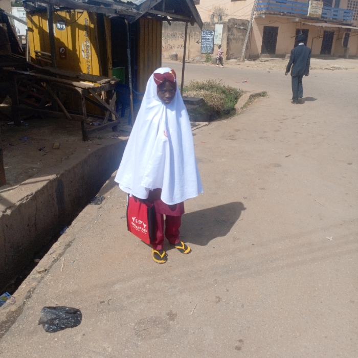 The image depicts an outdoor street scene under clear daylight conditions in the city of Jos, Nigeria. In the foreground, slightly right of center, a young individual, likely female, stands facing the viewer. She is clad in a white, full-length outer garment, possibly a hijab, covering maroon trousers. Her feet are adorned with yellow and black flip-flops. A red fabric tote bag with white text is slung over her left shoulder, positioned at her side. Her face displays a neutral expression. A distinct shadow is cast to her left on the dusty ground due to strong sunlight. A crumpled black plastic bag lies on the ground to her lower left. To the left, running parallel to the ground where the individual stands, is an open concrete drainage channel. Beyond this channel, a makeshift commercial structure is visible, constructed from yellow corrugated metal panels supported by wooden frames. A partial blue sign and additional text are discernible on its facade. In the mid-ground, a paved road extends into the distance. A male figure, dressed in a dark suit and trousers, is observed walking away from the viewer towards the right side of the frame. Further in the background, a series of multi-story buildings, appearing to be residential or commercial with weathered facades, line the street. A third individual is partially visible, seated in the far background near these buildings. Sparse green foliage is present between the road and the distant structures. The scene suggests a bustling urban or semi-urban environment.