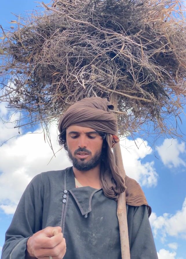 A man with a brown turban and a grey tunic stands against a vibrant blue sky dotted with white clouds. He holds a small, dark object in his right hand, his gaze directed downwards with a slight frown. Behind him, balanced atop a wooden pole, is a large, spherical mass of dry twigs, resembling a sizable nest. The scene exudes a rustic, outdoor feel.