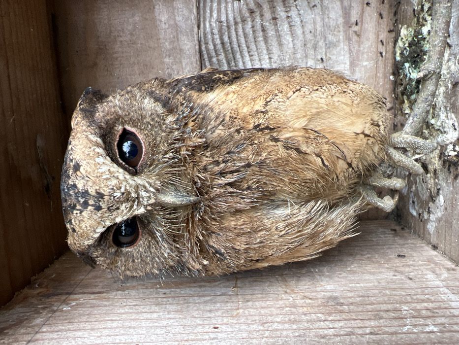 - "An owl lies sideways in a wooden box" by FM-xgQP92, licensed under CC BY 4.0