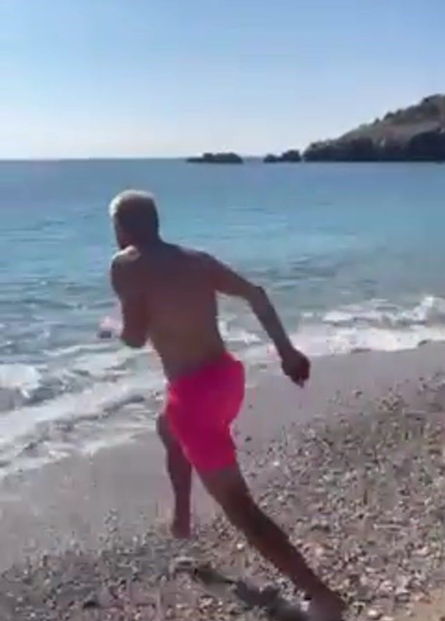 A man with blond hair, shirtless, and wearing pink shorts runs barefoot across a pebble beach and into the ocean