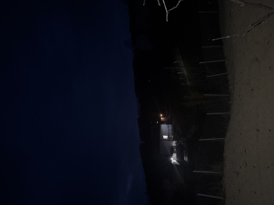 This image depicts a nighttime scene in the city of Byal Izvor, Bulgaria. The central focus is a two-story, light-colored residential structure situated on a hillside. Multiple windows and exterior lights on the house are illuminated, casting a warm glow onto its immediate surroundings and a portion of a gravel or dirt driveway where a parked white vehicle is partially visible. The house is partially obscured on its left by a darker, possibly overgrown area, while a small, dark wooden shed or outbuilding with an illuminated exterior light is visible to its right, further up the slope. The terrain around the house is uneven and vegetated with sparse, bare trees and shrubs. In the foreground, a wire fence with wooden posts runs horizontally across the lower third of the frame, separating a dark, earthy ground area from the illuminated house and hillside beyond. The upper portion of the image is dominated by a dark blue-black night sky, with a subtle lighter band visible on the far left horizon, indicating very early morning or late evening twilight. No individuals or specific actions are discernible within the frame.
