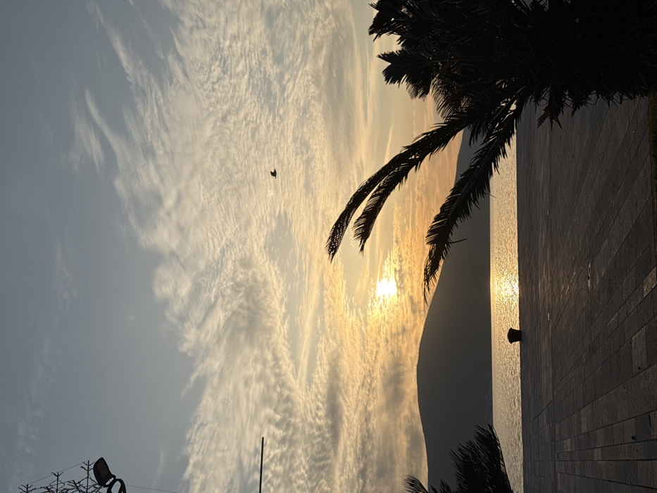 This image depicts a sunset or sunrise over a calm body of water, likely in the Bay of Kotor, viewed from a paved waterfront promenade in Tivat, Montenegro. The foreground features a grey paved promenade, with a dark bollard positioned near the water's edge slightly left of center. The water reflects a bright, shimmering path of sunlight directly towards the viewer. In the midground, a dark, silhouetted mountainous landmass rises from the water, topped by a small, indistinct structure. The sky is filled with altocumulus clouds, displaying a gradient from light blue at the top to warm orange and yellow hues near the horizon, where the sun is prominently visible but partially obscured by clouds. Several palm trees are silhouetted against the bright sky, with a prominent tree on the right side and another partially visible on the left. A single dark bird is in flight in the upper-right quadrant of the sky. A portion of a street light fixture is visible in the upper-left corner of the frame. There are no individuals or other significant moving objects present in the scene.
