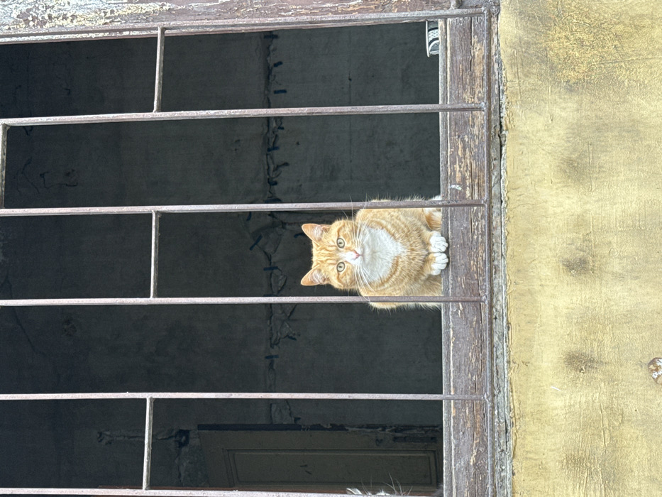 - "An orange tabby cat with a white chest and muzzle is seated centrally on a weathered wooden window ledge behind a rusted, dark metal security grill" by FM-Qys7F2, licensed under CC BY 4.0