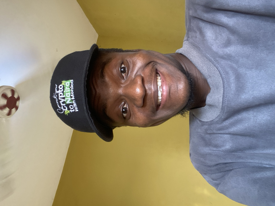 The image presents a headshot of a smiling young adult male, centered within an indoor setting. The individual has dark skin, wide-open eyes, and a broad smile displaying upper and lower teeth, including a noticeable gap between his two front upper incisors. Sparse dark facial hair outlines his jawline and chin. He is wearing a black baseball cap, embroidered with white and green text that reads: "Convert your Crypto to Naira With Mohlad". His attire also includes a plain grey, long-sleeved crew-neck shirt. The background consists of a plain yellow wall in the lower and right sections, meeting a white ceiling in the upper section. A portion of a round ceiling fixture, exhibiting a red and white radial pattern, is visible on the white ceiling above and behind the individual. The specific location within the city of Egan, Nigeria, cannot be determined from the visual information present in the image.