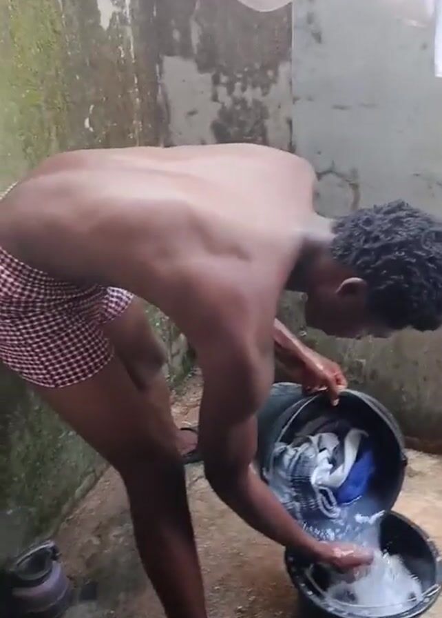 A shirtless man in shorts is standing in an outdoor wash area. He is transferring laundry from one black bucket to another, filled with soapy water. The wash area has concrete walls and a tiled floor. A few other objects are visible, including a kettle, a drain, a metal frame, and a lime.