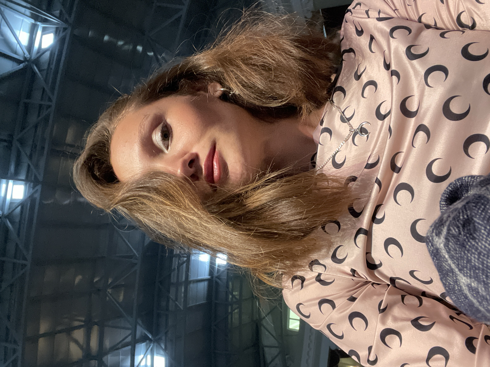 A low-angle, close-up portrait shows a female subject with light brown, shoulder-length hair, styled with a side part that partially covers her forehead and right eye. She wears a glossy pink lip color and white eyeshadow on her visible left eye. Her attire consists of a light pink, possibly satin, long-sleeved top featuring a repetitive pattern of black crescent moons. Adorning her neck is a silver chain with a crescent moon pendant, and a small silver hoop earring is visible on her right ear. A folded blue and white patterned fabric object is partially visible in the lower-left corner. The background reveals a dark, high ceiling structure comprising an exposed metal truss system with embedded rectangular fluorescent light fixtures. This indoor setting is located in the city of Sochi, Russia, consistent with a large public building or venue.