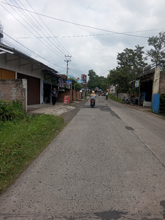 The image depicts a straight paved road in Khajuripada, India, under an overcast sky. The road surface is gray concrete or asphalt, displaying various dark patches and seams. On the left, a grassy verge borders a low concrete wall, beyond which stands a building with a light facade and two dark, closed garage-style doors. Further down on the left, another building with an open storefront and a green awning is visible. A male individual, dressed in a dark blue shirt and dark pants, stands near this storefront, facing towards the road. A red and white A-frame sign is positioned on the sidewalk in front of this building. Overhead, numerous power lines crisscross the sky, supported by utility poles. In the midground, a person wearing a light-colored helmet and jacket is driving a dark-colored scooter or motorcycle away from the viewer, centrally positioned on the road. Several other vehicles, primarily motorcycles, are visible further down the road, heading in the same direction or parked. On the right side of the road, buildings of varying construction are present, interspersed with green trees. A prominent, unfinished-looking concrete structure with a blue lower section stands on the right in the midground. Several parked motorcycles are visible on the right side of the road further down. The overall environment suggests a semi-urban or suburban street with commercial and residential elements.