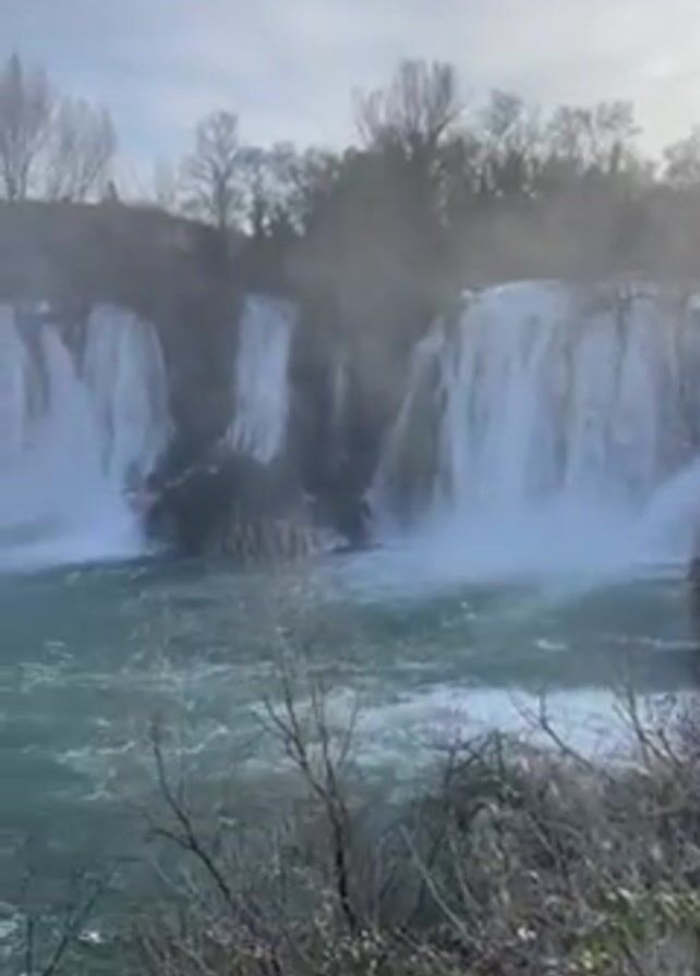 waterfall cascading into a turquoise river. The water falls in multiple streams from different heights, creating a misty spray in the air. The surrounding landscape includes trees and shrubs, some of which are bare, suggesting it might be late fall or winter. The sky is bright, with some clouds visible. The camera slowly pans to the left, revealing more of the waterfall and the river it feeds into.