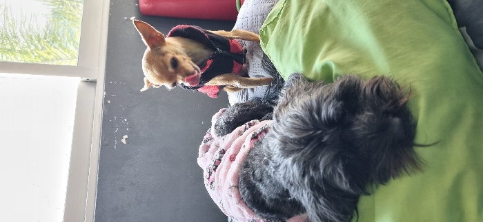 The image depicts an indoor scene in San Bernardino Tlaxcalancingo, Mexico, featuring two dogs. In the foreground, a dark-furred dog, characterized by medium-length wavy dark grey fur on its head, lies with its head resting on a lime-green pillow or blanket. Its body, partially obscured, is covered by a soft, pink garment adorned with a darker, repeating pattern. To the right and positioned slightly behind the first dog, a light brown Chihuahua stands on a white, textured fabric surface, possibly a bed or cushion. This Chihuahua wears a black zippered jacket with pink accents on the collar, zipper line, and hood interior, and its tongue is extended, licking its upper lip. The background consists of a dark grey wall showing minor flaking or discoloration, above which a window with white frames allows natural light to enter the room. Green foliage is visible through the window. A portion of a cylindrical red object is present on the extreme right edge of the frame.
