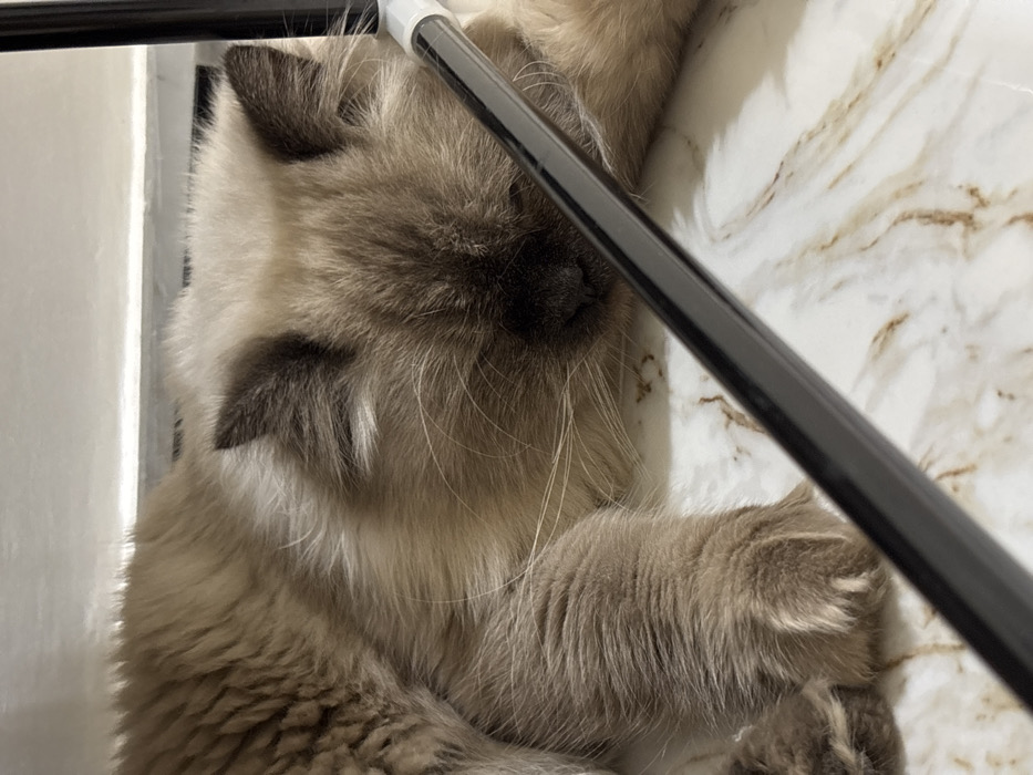 A long-haired domestic cat, exhibiting a cream-colored body with dark seal-point markings on its face, ears, and paws, is depicted lying on a white and brown veined marble surface. The cat's eyes are closed, indicating a state of rest or sleep. Its front paws are extended forward. A dark, slender cylindrical object with a white cap at one end diagonally crosses the foreground from the upper right to the lower left, partially obscuring the cat's lower face and right paw. The background consists of a light-colored wall or panel with a dark horizontal line. This indoor scene is located in Mu'adammiyat ash-Sham, Syria.