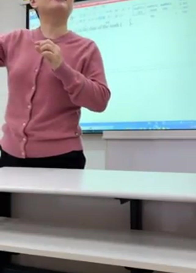A woman stands in front of a white table. She is wearing glasses, a pink cardigan, and black pants. Behind her is a projection screen displaying a computer document. The woman gestures with her hands as she speaks. The setting appears to be a classroom or lecture hall.