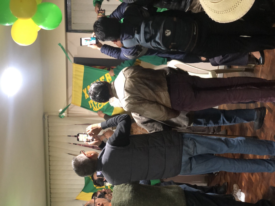 People stand in a room, taking pictures with their smartphones. A green and yellow flag with writing hangs in the background, while green and yellow balloons are in the upper left corner. Most subjects are wearing casual clothing. Some are wearing glasses or hats. The lighting appears to be from overhead, and the background is mostly white walls.
