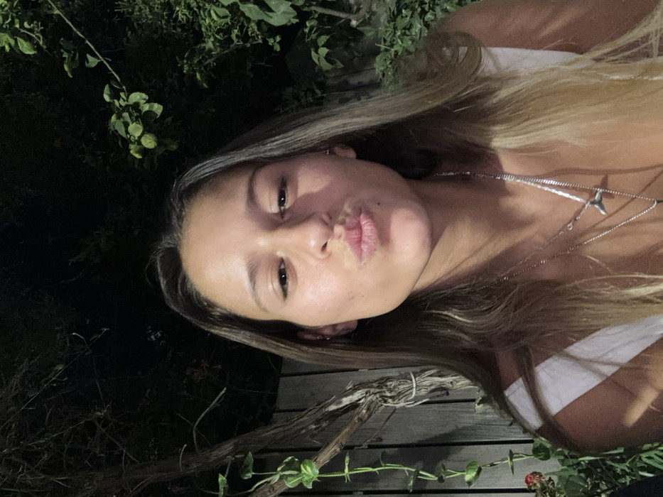A single female individual is depicted in a close-up, head-and-shoulders portrait, outdoors at night in Tel Aviv, Israel. The subject, a young adult with fair skin and long, straight, multi-toned brown hair, faces forward with lips pursed in a kissing gesture. She wears a white top with wide straps and multiple silver-toned necklaces, one featuring a small pendant resembling a whale tail. Small stud earrings are visible. The background is dark, indicating nighttime. To the left, a wooden fence or trellis supports a climbing plant with green and variegated leaves, alongside a bare tree branch. Small reddish plant elements are visible near the bottom left. To the right, dense dark green foliage from various plants and trees fills the frame. The subject is illuminated by a direct light source, creating a stark contrast with the underexposed background environment.