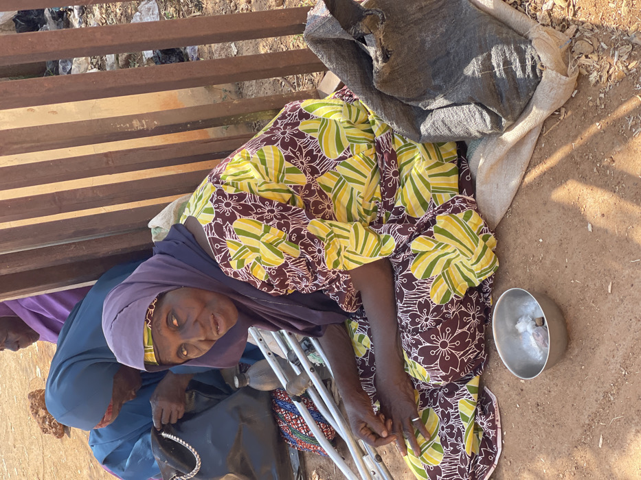 The image depicts an outdoor scene in Samaru, Nigeria. An elderly woman, dark-skinned with visible facial lines, is seated on reddish-brown dirt ground, facing forward and slightly to her left. She wears a dark purple head covering over a long dress patterned in yellow, green, and brown floral designs. Her eyes exhibit a cloudy discoloration. Her hands are clasped in her lap. Directly in front of her on the ground is a silver-colored metal bowl containing several small, light-colored objects. A pair of silver-colored crutches are visible on the ground behind and to her left. To her immediate right, a dark grey woven sack rests on a lighter-colored woven mat. Behind the primary subject, another woman wearing a blue head covering is seated on the ground, looking downwards, with a black bag near her. A third individual in a purple head covering is partially visible further in the background. The background features a vertical structure composed of multiple rusty brown corrugated metal sheets or planks. Scattered debris, including plastic items, is present on the ground near the metal structure. The scene is illuminated by direct sunlight, casting distinct shadows.