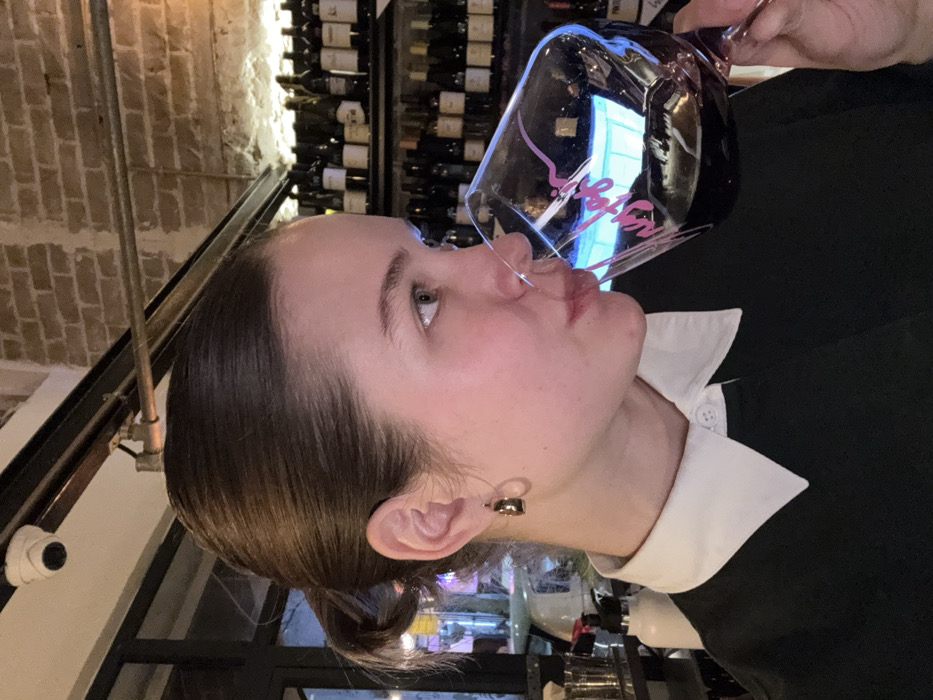 A woman is shown in a side profile view, holding a large wine glass to her lips. The glass contains a dark liquid. She is wearing a black top with a white collared shirt underneath. Her brown hair is pulled back. In the background, there is a wine rack filled with numerous bottles, and part of a brick wall is visible. There's also a security camera attached to the wall.