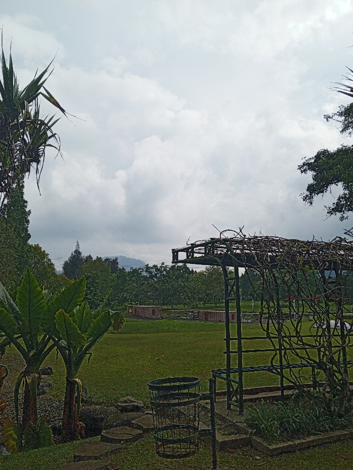A lush garden scene under a cloudy sky. Verdant grass stretches towards a brick structure in the distance. An ornate metal trellis, partially covered in vines, stands in the foreground next to a green metal waste basket. Large tropical plants with vibrant green leaves anchor the scene on the left, while tall trees frame the right. Hints of distant mountains are visible between the trees.