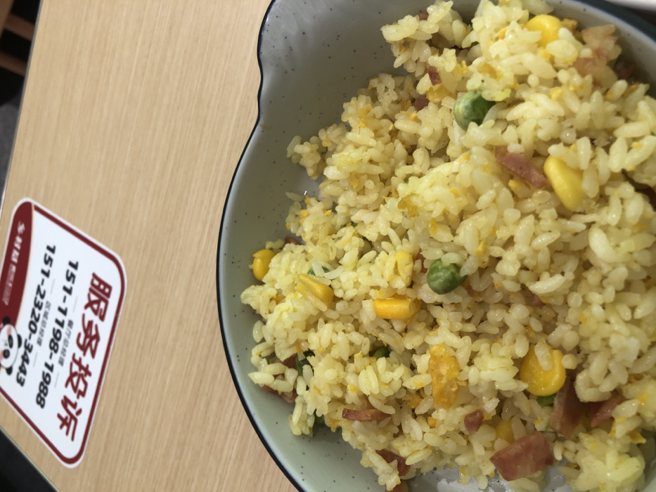 A light grey ceramic bowl, featuring a subtle dark rim and an irregular upper edge, contains a portion of fried rice. The fried rice comprises white rice grains, interspersed with visible yellow corn kernels, green peas, and diced pinkish-brown meat pieces, likely ham or bacon. The bowl rests on a light wood-grain table surface. In the upper background, positioned on the table, is a rectangular red and white sticker. The sticker displays the Chinese characters "服务投诉" (Service Complaint) in bold, accompanied by two phone numbers: "151-1198-1988" and "151-2320-3443". A stylized red panda head logo is also present on the sticker, identifying the establishment as a "Red Panda Hotpot" restaurant, located in Yuzhong District, China. No individuals or active interactions are visible in the scene.