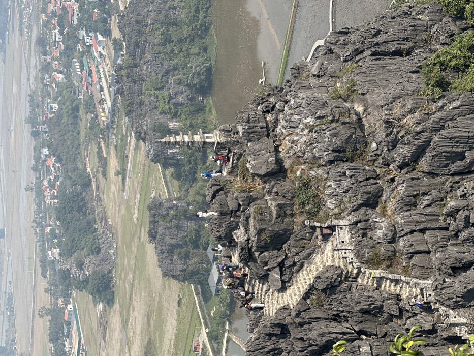 A scenic view from a rocky mountain overlooks a landscape with rice paddies, rivers, and a village. People are visible on a stone path ascending the mountain towards a multi-tiered pagoda. The steep rocky terrain is interspersed with greenery. The perspective gives a sense of height and depth.