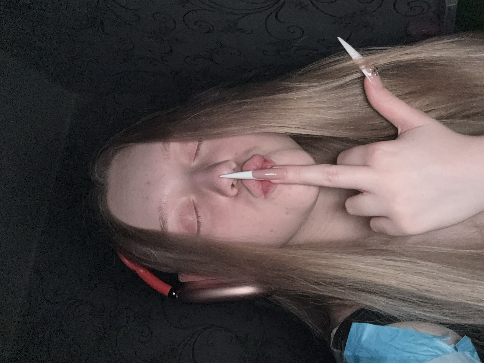 A young, light-skinned female is seen from a close-up, angled perspective. She has long blonde hair, closed eyes, and is making a pouting expression. She is holding her right index finger, adorned with a long, pointed artificial nail, vertically against her lips and nose. Headphones with a red accent are visible near her ear. Part of a blue medical mask can be seen near the bottom right corner of the frame. The background appears to be a dark, patterned surface. There is no indication this picture was taken in the city of Saratov, Russia.