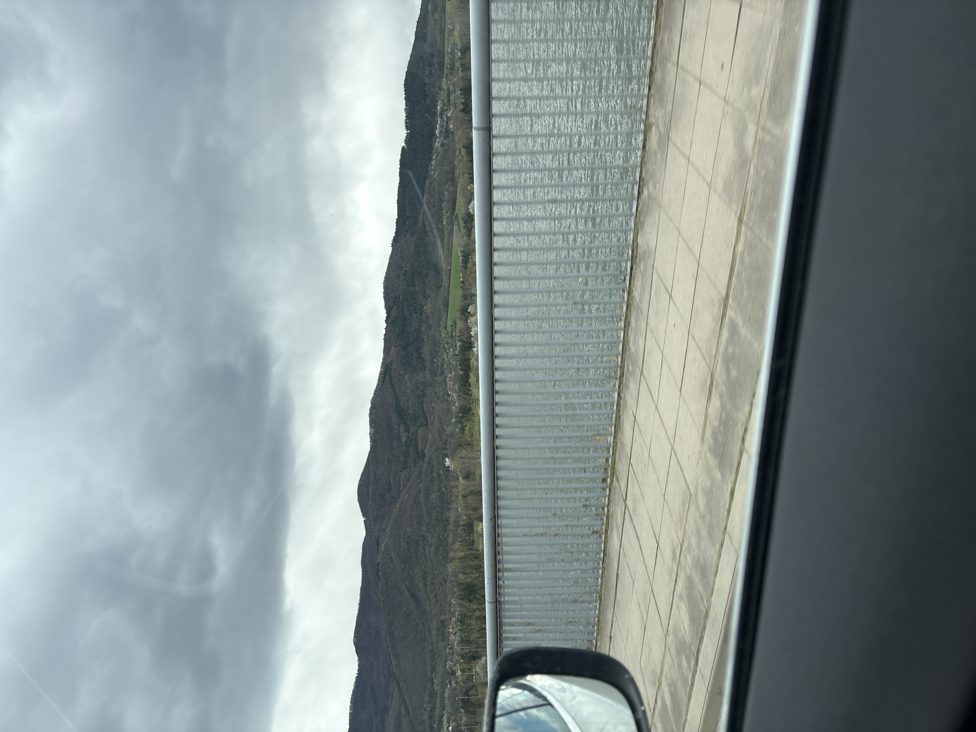 view from inside a vehicle, possibly a car, as it travels on a bridge or elevated road next to a body of water