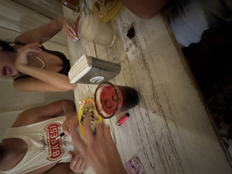 A table scene shows two people dining. One person wears a white tank top with an Italian logo and gestures towards food on a yellow plate. A red and black drink with a smiley face etched in the foam sits nearby, along with a pink lighter and a small card. Another person wears a low-cut black top and a pearl necklace, sitting beside a large glass of a lighter beverage and a container of napkins. Keys are also visible on the table.