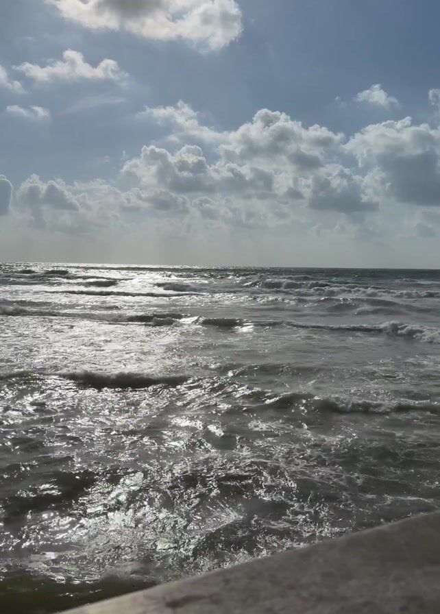The camera films from an elevated position, looking out over a somewhat choppy ocean. The sun is bright, but filtered through puffy white clouds scattered across a blue sky. Sunlight glints on the waves. A bit of a light-colored ledge is visible at the bottom of the frame, suggesting the camera is on a pier or similar structure. There is no visible human activity.