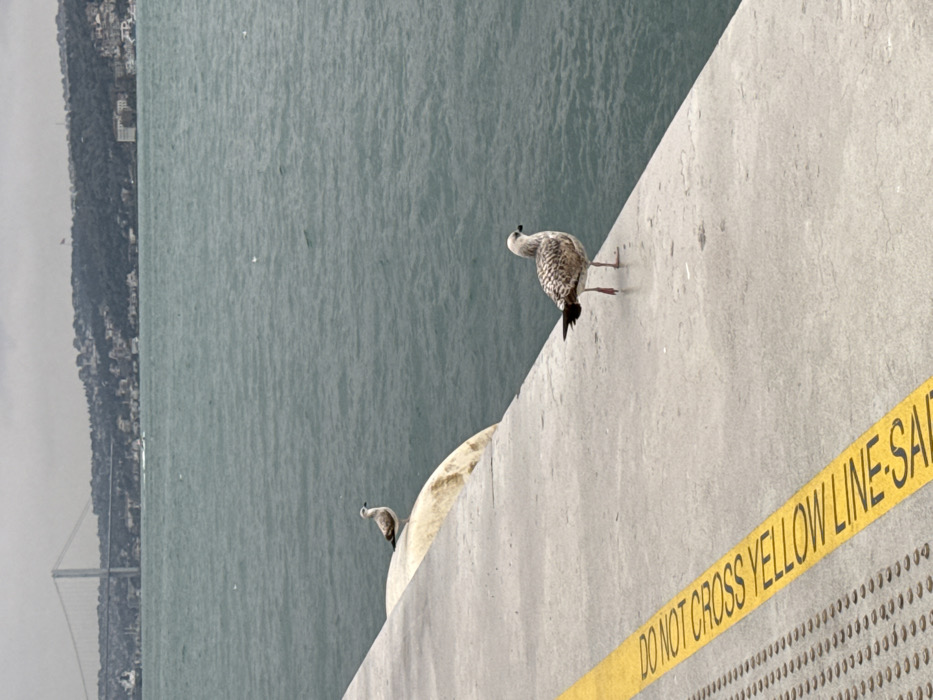 The image depicts a scene along the Bosphorus Strait in Beyoğlu, Istanbul, Turkey, likely from a pier or promenade in the Karaköy district. The foreground features a grey concrete surface, possibly a pier or walkway, extending from the bottom left corner diagonally towards the mid-right. A bright yellow safety line with black text, partially visible as "DO NOT CROSS YELLOW LINE - SAF", runs along the edge of this concrete structure. Adjacent to the yellow line on the left is a textured strip of tactile paving. Two seagulls are present on the concrete structure. One seagull, with mottled grey and white plumage and reddish-pink legs, stands on the flat concrete surface near the yellow line, positioned in the lower-right quadrant and facing right, away from the water. Further back and slightly to the left, a second seagull of similar plumage, appearing slightly smaller, is perched on a rounded, lighter-colored concrete barrier or bollard. This seagull faces left, towards the distant shoreline. The midground is dominated by the teal-colored, moderately rippled water of the Bosphorus Strait, with a few small white specks, possibly other birds or debris, visible on its surface. The background reveals the Bosphorus Bridge, a grey suspension bridge with two prominent towers, spanning the strait from left to center. Beyond the bridge and water, a rolling hillside densely covered with vegetation and scattered urban buildings forms the distant Asian shore of Istanbul. The sky is overcast and uniformly grey. No human figures are visible in the scene.