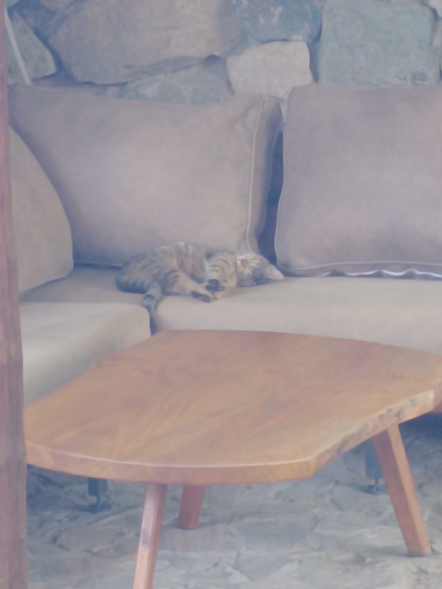 A cat is sleeping on a beige couch with two cushions. A wooden table stands in front of the couch. The background features a stone wall. This image was taken in Septemvri, Bulgaria.