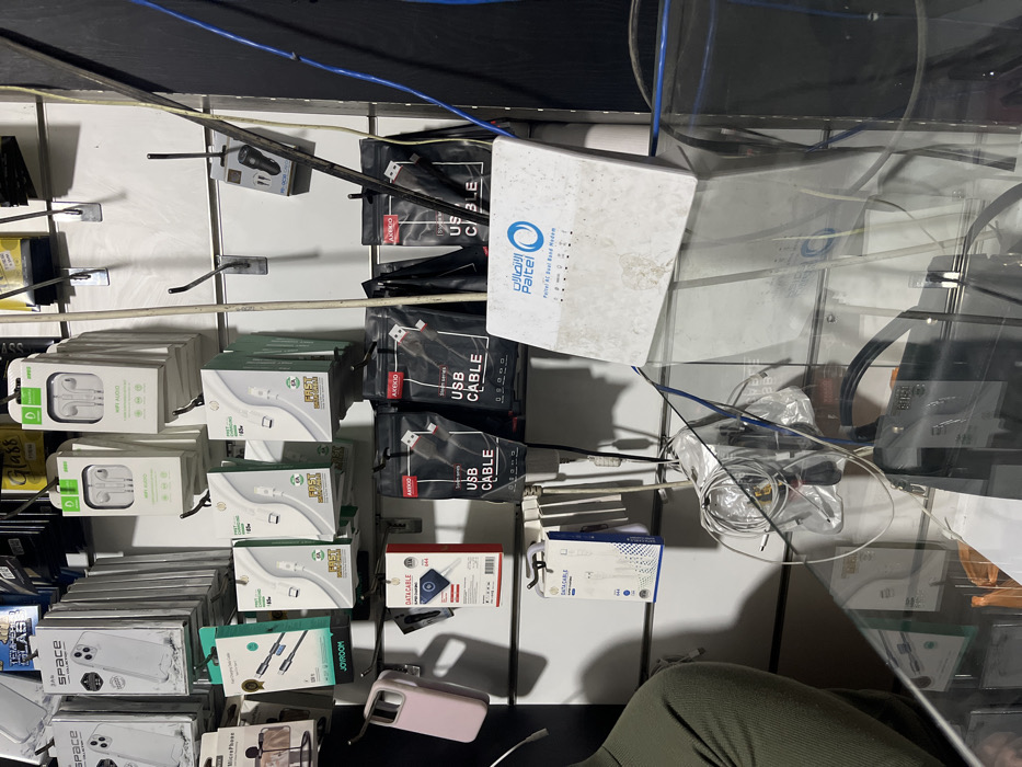 A retail display shows a variety of electronic accessories hanging on hooks. These items include headphones, USB cables, and phone cases. Brands such as JOYROOM and AXEKIO are visible. A Paitel modem sits atop some of the merchandise near a glass display case filled with cables. The display is organized in a grid-like fashion with the products stacked vertically. A person wearing olive-green pants is partially visible in the foreground.