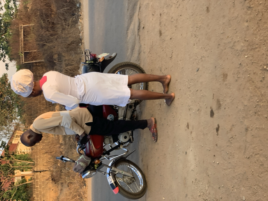 Two people are posing with a red motorcycle on a dirt road. A woman in a white dress and head covering stands beside the motorcycle's seat, barefoot. A man in a beige shirt and black pants sits on the motorcycle, wearing sandals. The background features dry vegetation and buildings. The road appears to be a mix of dirt and asphalt.