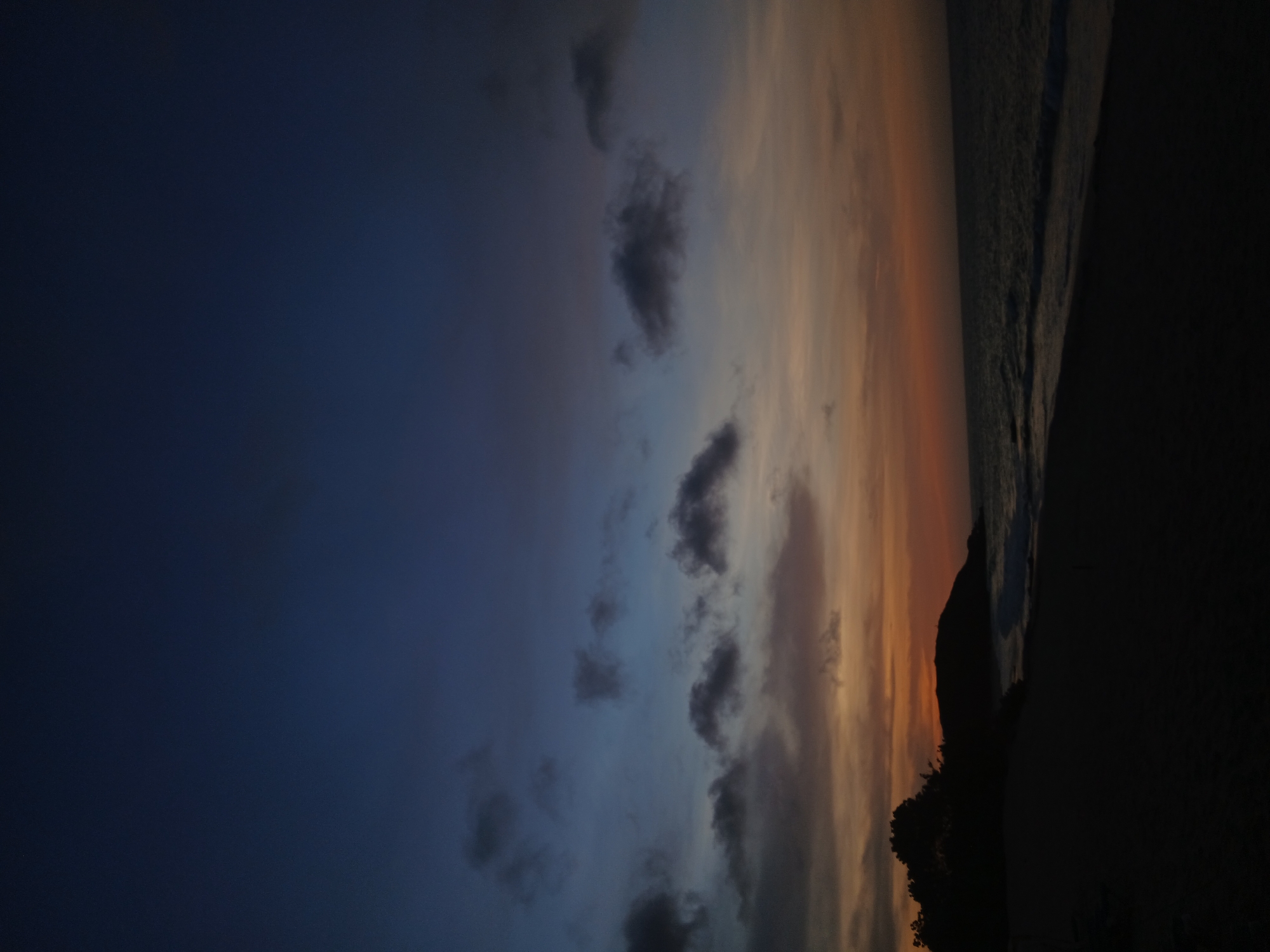 The image captures a twilight scene, likely a beach landscape, in Altagracia, Venezuela. The sky is divided into a dark blue expanse on the left and a gradient of orange and light tones towards the right. Several dark clouds are scattered across the sky. Along the horizon line, what appears to be a beach is visible, transitioning to a dark, silhouetted area containing foliage. The overall scene evokes a sense of dusk or early nightfall.