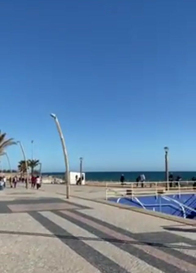 sunny seaside promenade. The camera moves along a paved walkway with palm trees on one side and the ocean on the other. People are walking along the promenade. There are street lamps and blue and white benches. The sky is clear and blue. The ocean is visible in the background. The sun is shining brightly.