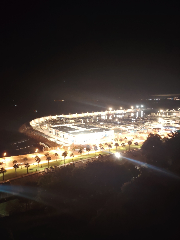 This nighttime, elevated panoramic image depicts the Tanger City Marina and surrounding port area in Tangier, Morocco. A dark body of water, likely the Strait of Gibraltar or Tangier Bay, occupies the upper left quadrant. A prominent, brightly lit, curved sea wall or breakwater delineates the coast. Inland from this barrier, a complex of well-illuminated, white, flat-roofed buildings, consistent with port and terminal infrastructure, is visible. To the right of these structures, a marina basin is filled with numerous docked boats and yachts, intensely lit by overhead artificial lights that reflect on the water. A multi-lane road, lined with a continuous row of evenly spaced palm trees, stretches across the mid-ground, running parallel to the coastline. This road is brightly illuminated by numerous streetlights, casting distinct pools of light. The foreground consists of dark, unlit terrain, likely a hillside or elevated viewpoint, with dense, dark vegetation visible. A pronounced blue-white light flare emanating from an artificial light source is present in the lower center of the image. The upper portion of the image is dominated by a dark night sky, with faint, scattered lights visible on the distant horizon, suggesting another landmass or city across the water. No individuals, specific actions, or direct interactions are discernible within the frame.