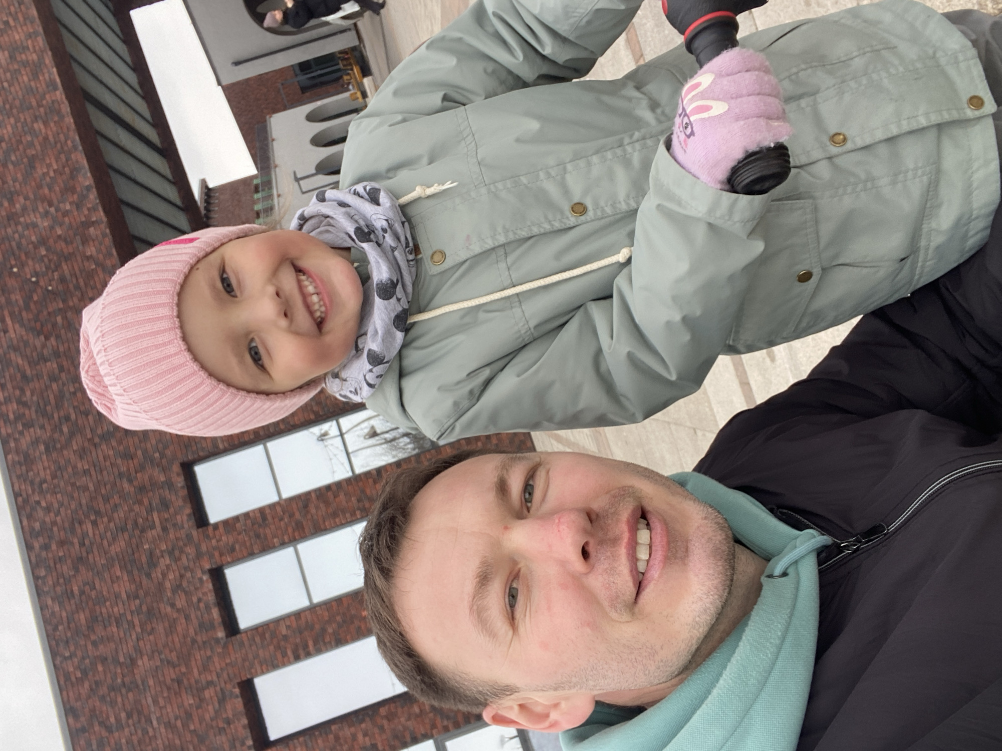 An outdoor, eye-level portrait-orientation image captures a male adult and a young female child. The adult male, positioned on the left, has short brown hair and light stubble, wearing a light turquoise hooded sweatshirt under a dark zipped jacket. He exhibits a faint red mark on the bridge of his nose and smiles directly towards the camera. The young female, positioned to the right and slightly behind the male, wears a pink ribbed beanie, a grey neck gaiter with a repeating dark patterned motif, a light sage-green collared jacket with brass-colored buttons and white drawstrings, and pink gloves with a white bunny graphic on the back of her left hand. She holds the black and red grips of what appears to be a small bicycle or balance bike and smiles broadly, showing her teeth. The background features modern architecture, including a building with a reddish-brown brick facade and several rectangular windows behind the subjects, and a lighter-colored building with multiple arched entryways further to the right. The ground is a light-colored paved surface. Bare deciduous trees are visible in the distant background under an overcast sky. The scene is located in Izhevsk, Russia.
