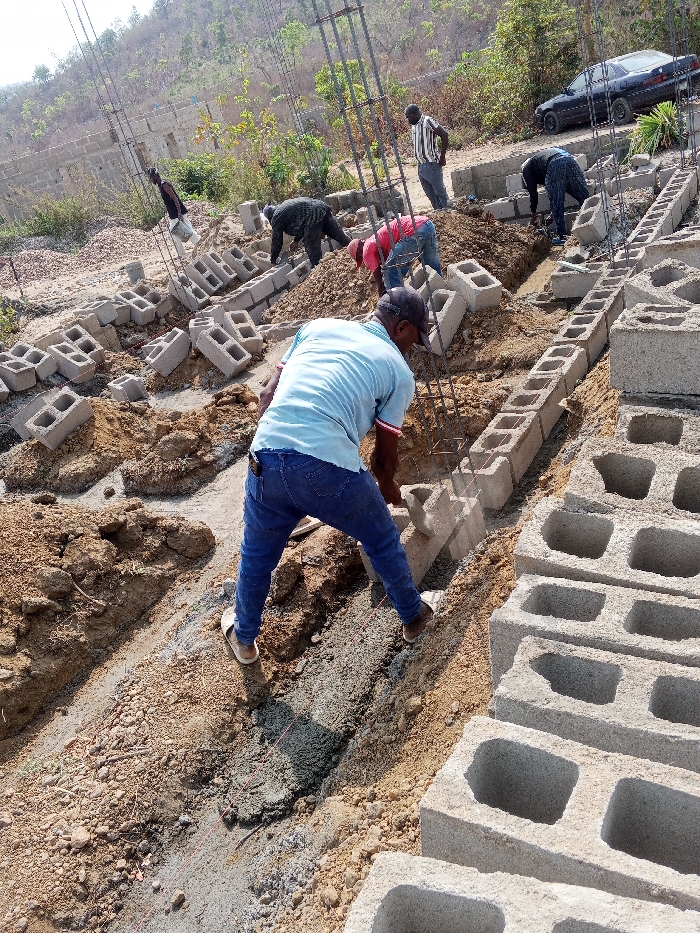 The image displays an active construction site in Lokoja, Nigeria, located on uneven, disturbed ground against a background of a vegetated hillside